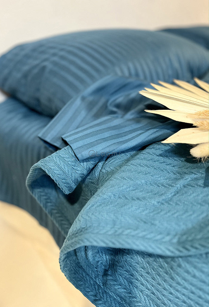 Страйп-сатин — це щільна, зносостійка та приємна на дотик тканина, яка не викликає алергій, чудово пропускає повітря та не втрачає кольору з часом. Завдяки натуральному складу (100% бавовна), виріб ідеально підходить як для домашнього використання, так і для готельного бізнесу.