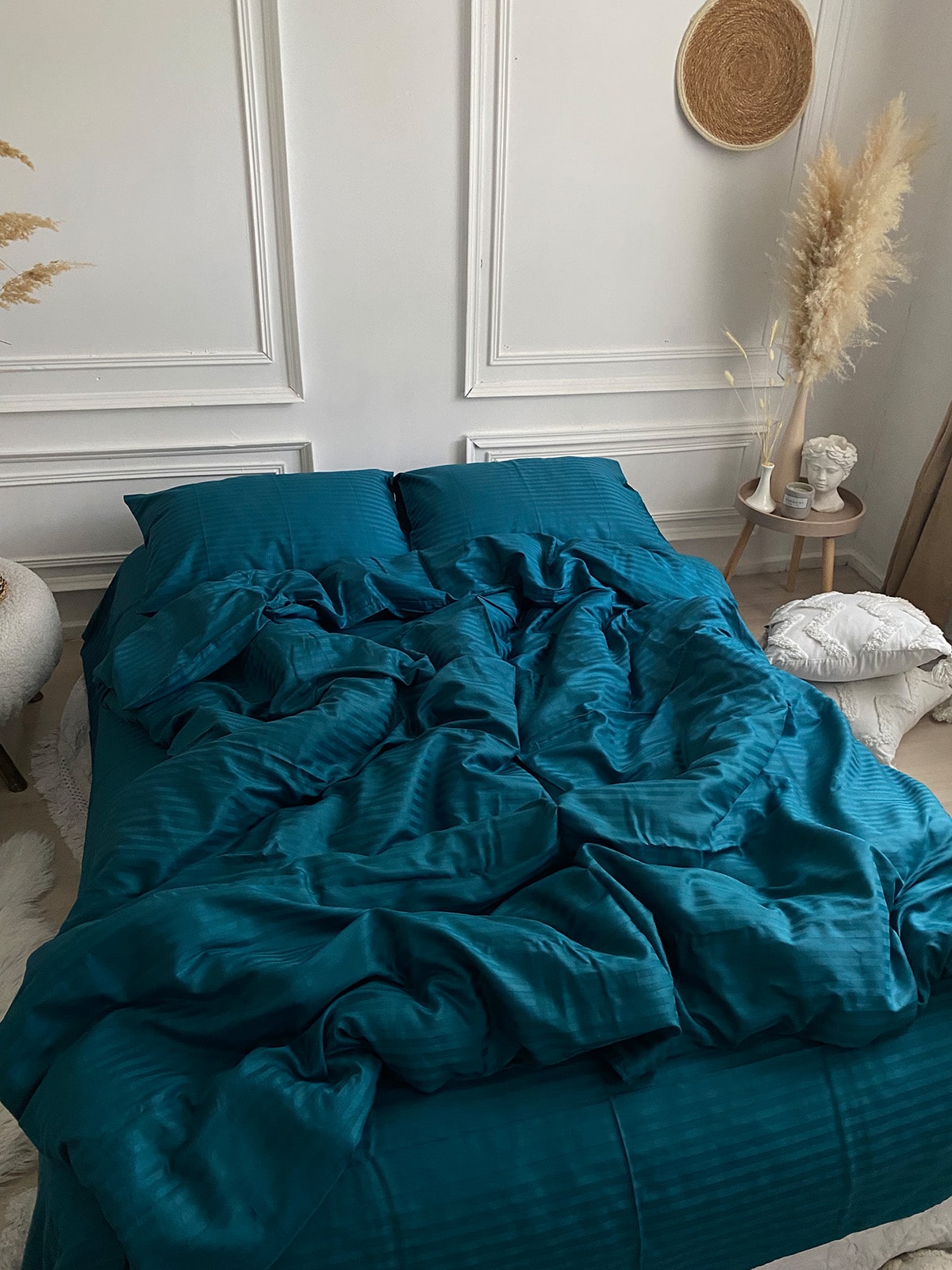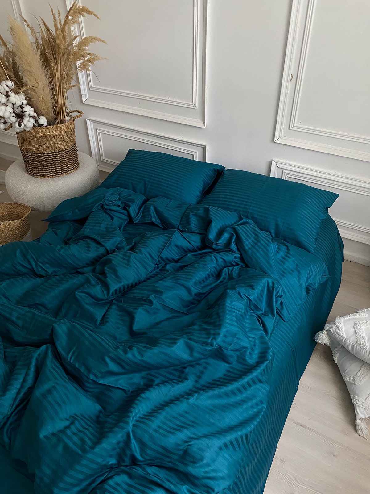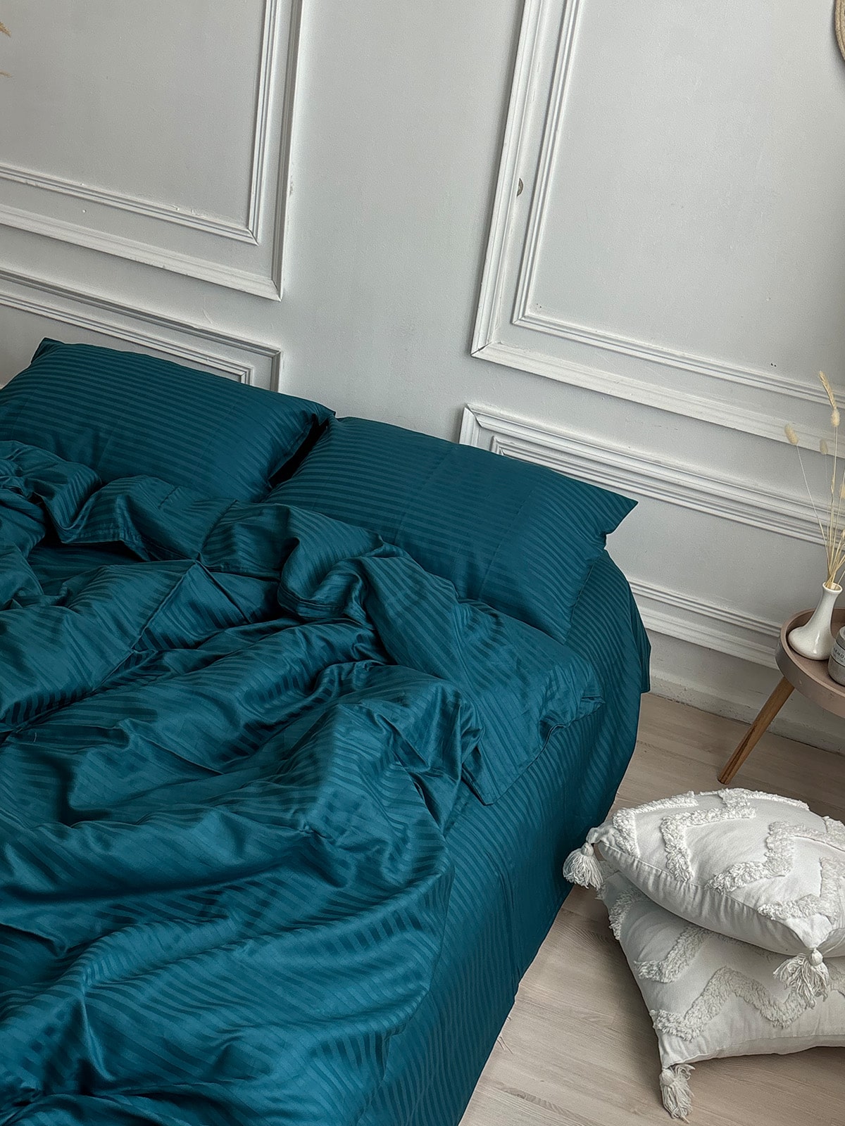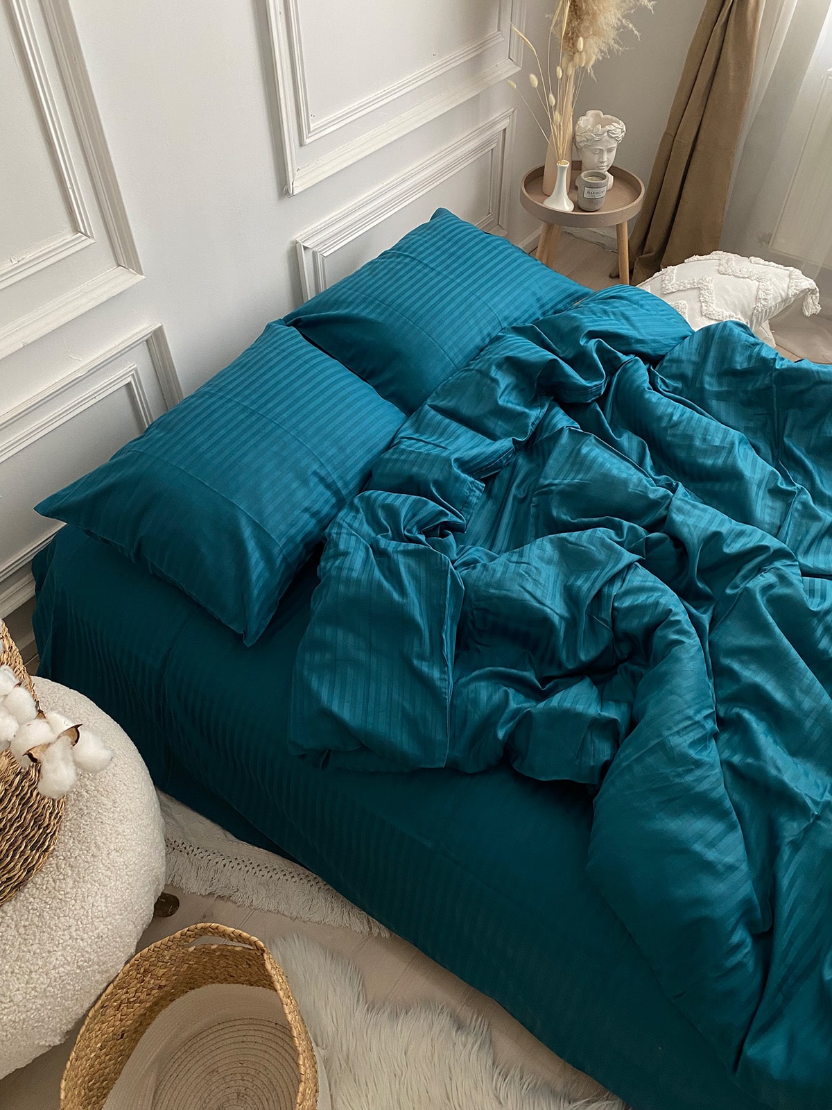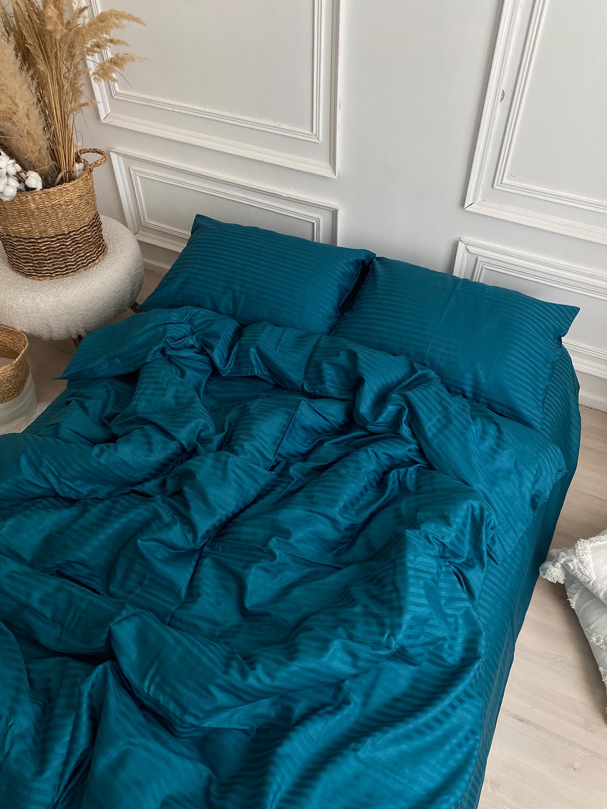 Постільна білизна з страйп сатину 100% бавовна — це поєднання вишуканої естетики та практичності для щоденного використання. Виготовлений із натуральної бавовняної тканини преміум-класу, цей комплект має гладку, шовковисту поверхню з характерним блиском та структурним візерунком у вигляді смужки шириною 1 см.
