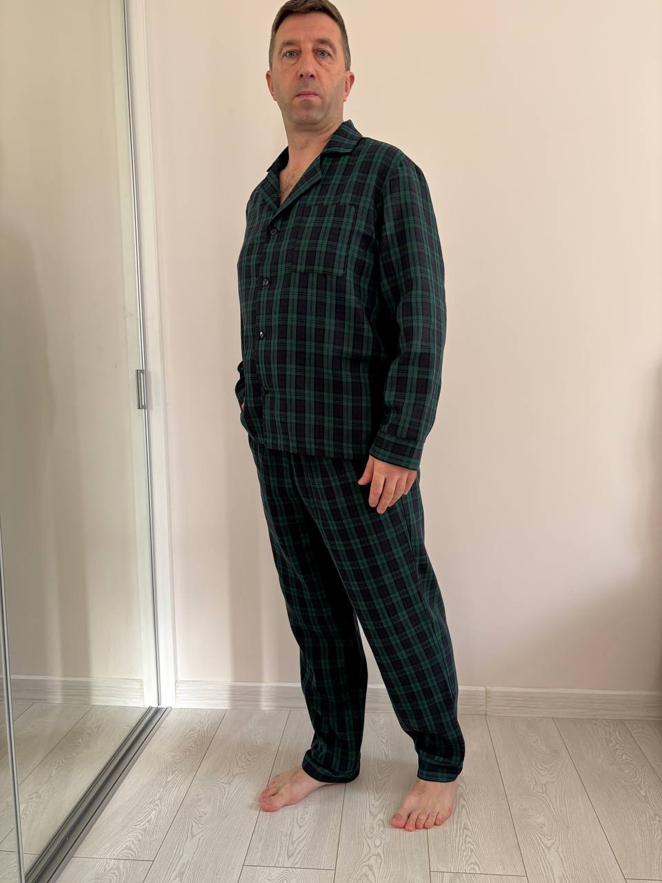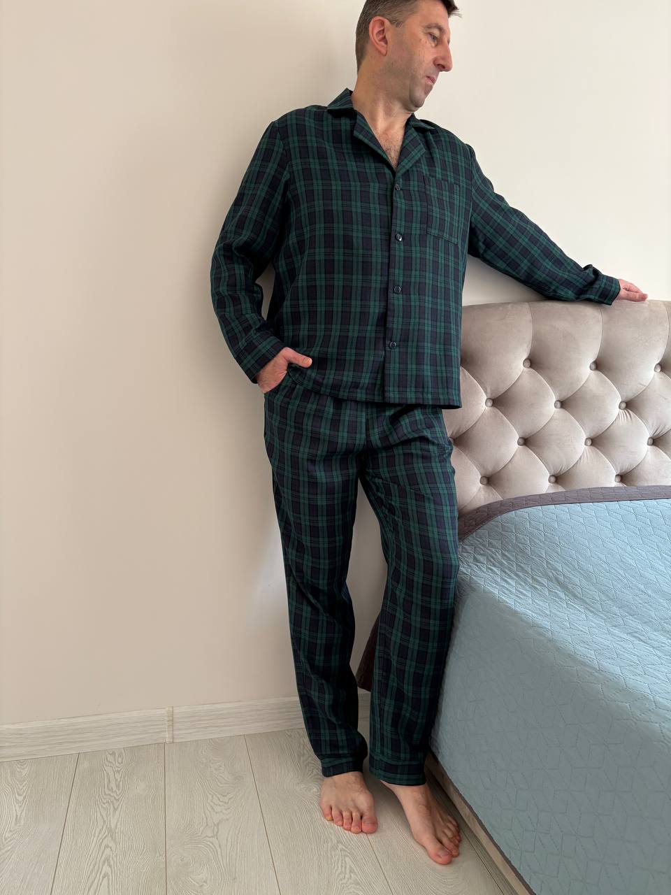 Цей чоловічий піжамний комплект із фланелі поєднує затишок, практичність і стиль. М’яка на дотик і тепла фланель забезпечує комфорт у прохолодну пору року, а класичний крій дозволяє використовувати піжаму не лише для сну, а й як домашній одяг.