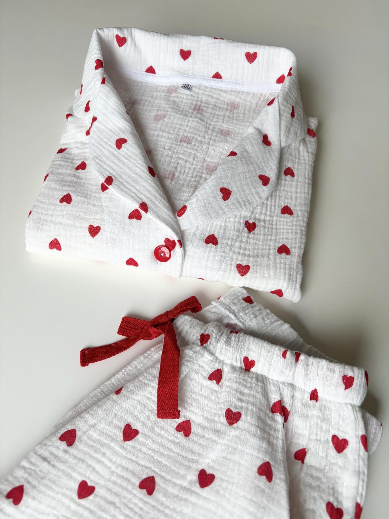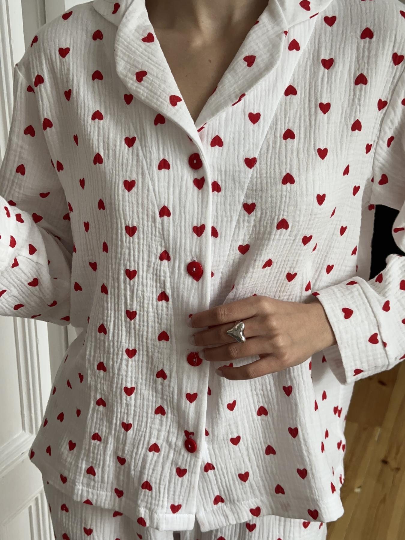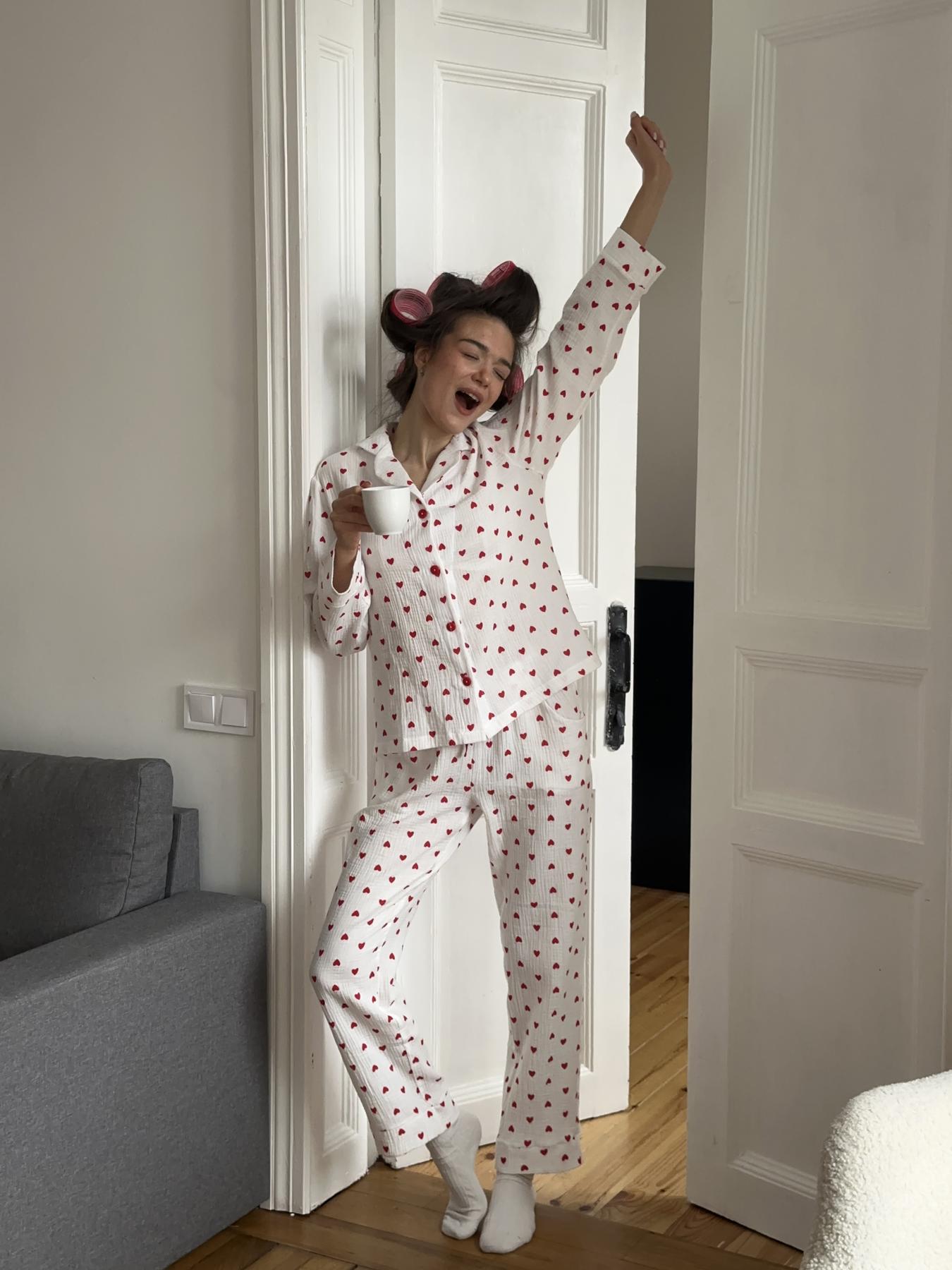 Коли хочеться затишку, легкості та стильного вигляду, обирай жіночу піжаму з мусліну. Цей домашній комплект зі штанів та сорочки виготовлений з ніжної муслінової тканини з 100% бавовни та прикрашений романтичним принтом із сердечками.