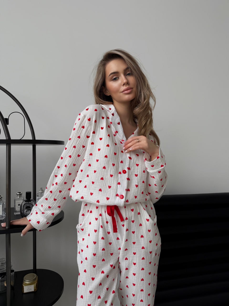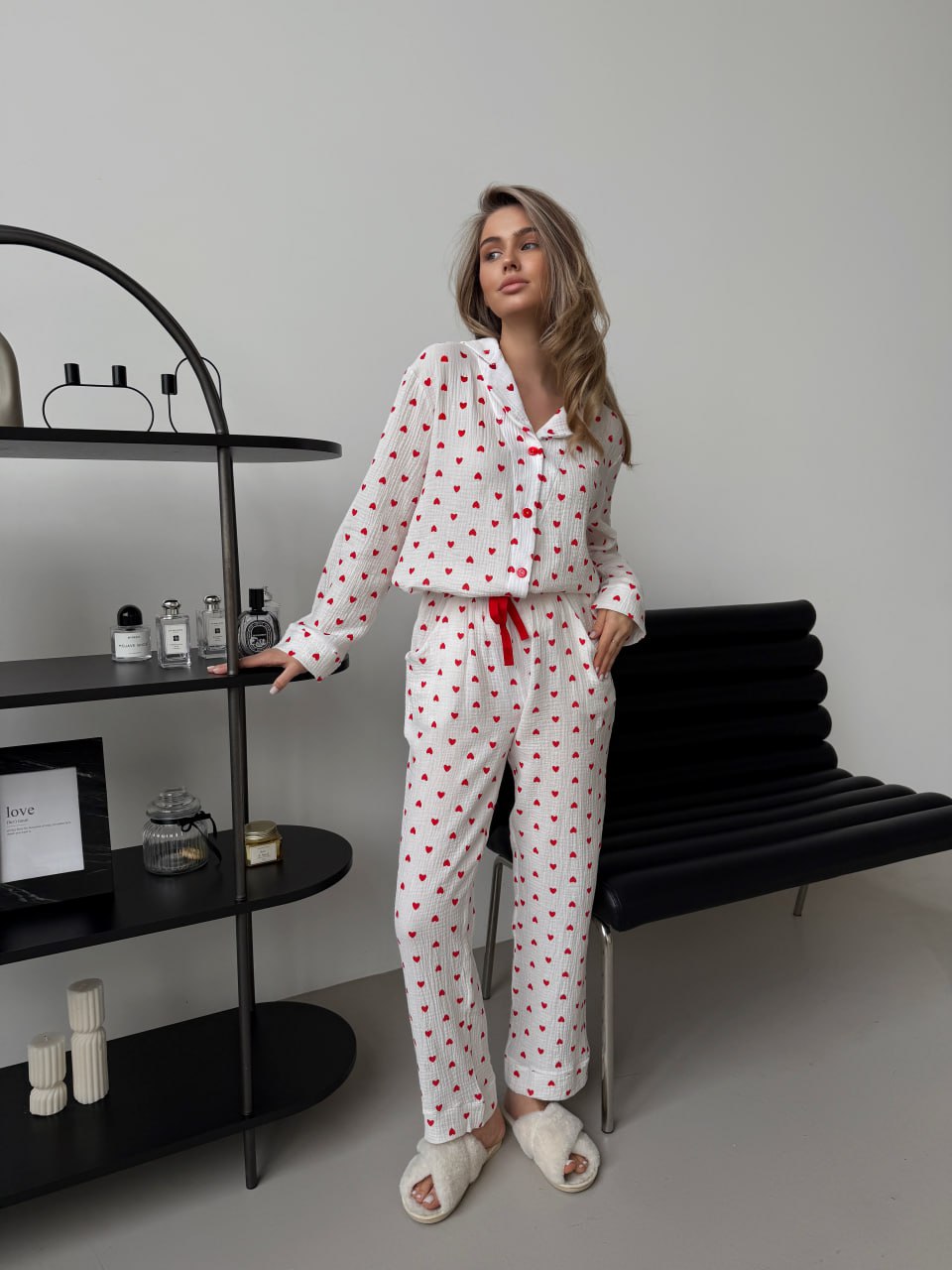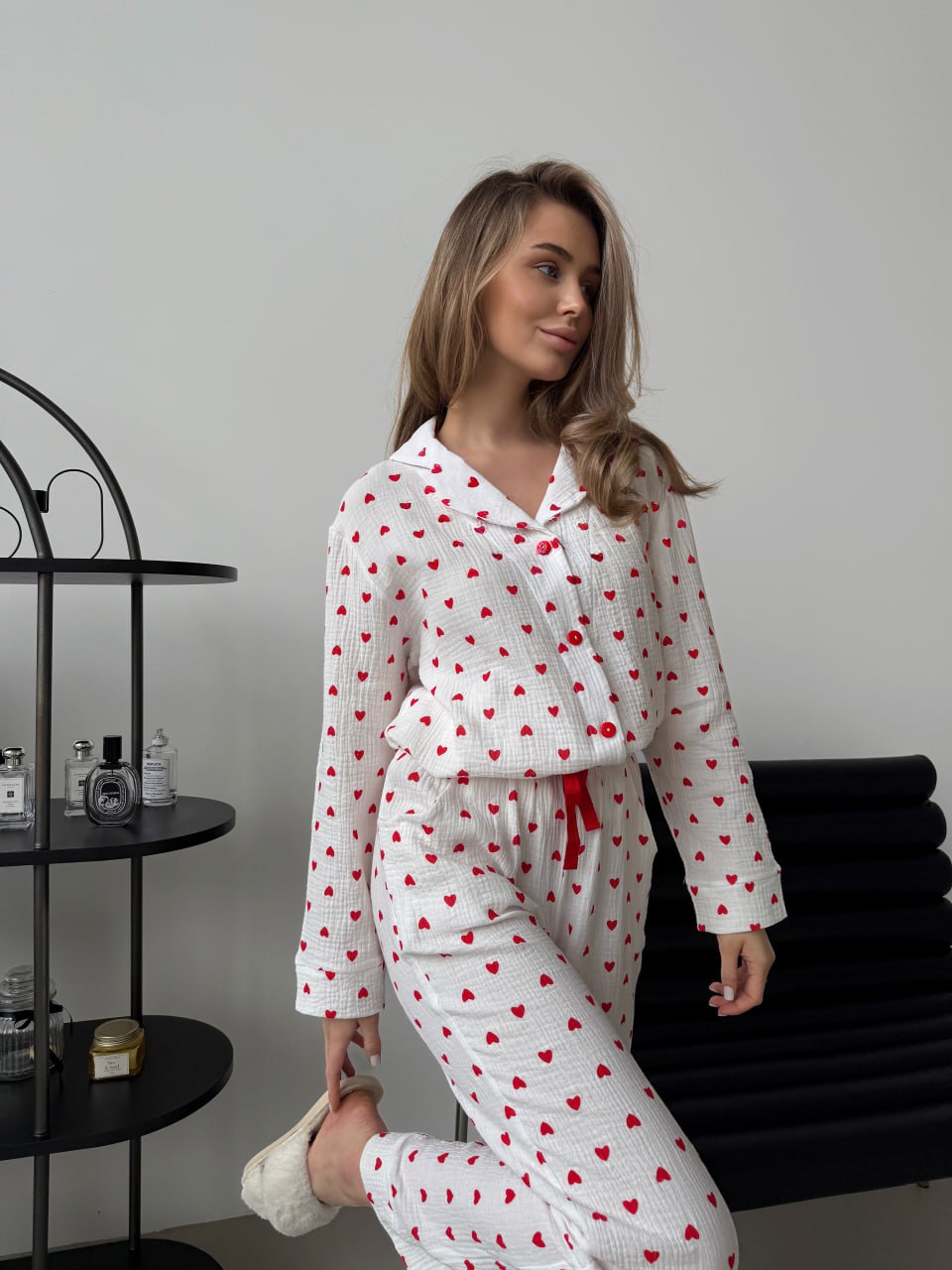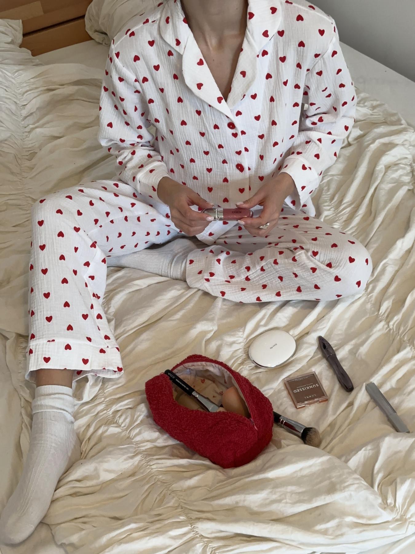 Коли хочеться затишку, легкості та стильного вигляду, обирай жіночу піжаму з мусліну. Цей домашній комплект зі штанів та сорочки виготовлений з ніжної муслінової тканини з 100% бавовни та прикрашений романтичним принтом із сердечками.