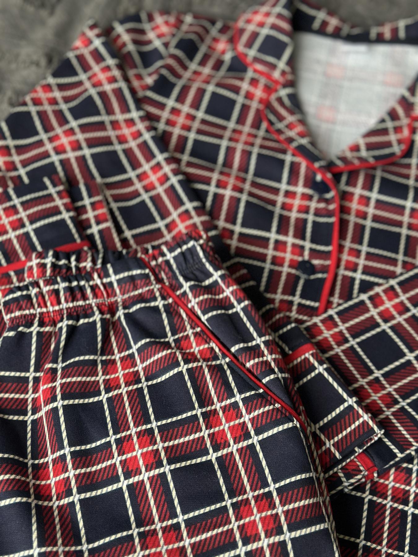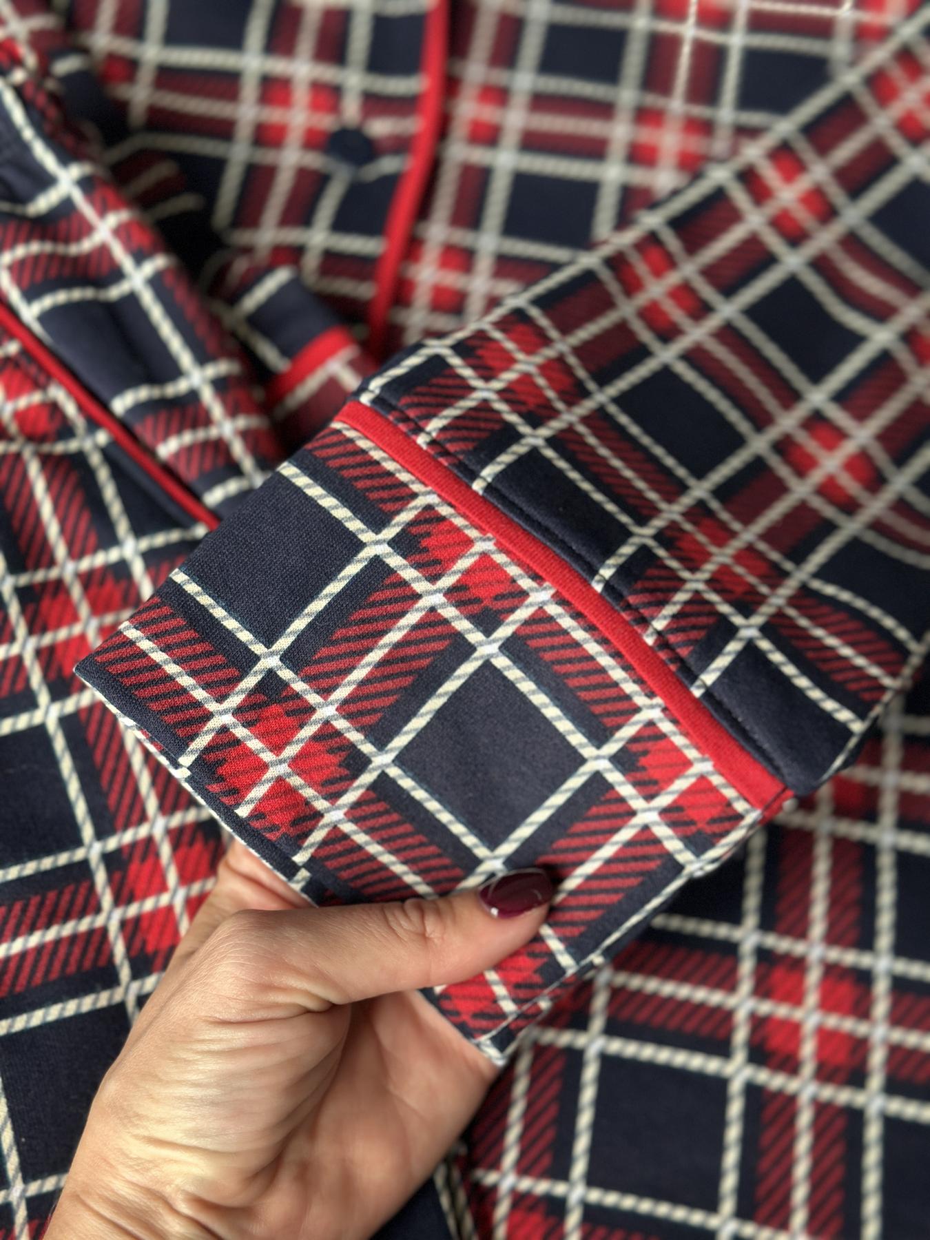 - Класичний принт у червоно-синю клітинку з контрастною червоною окантовкою додає святкового настрою;