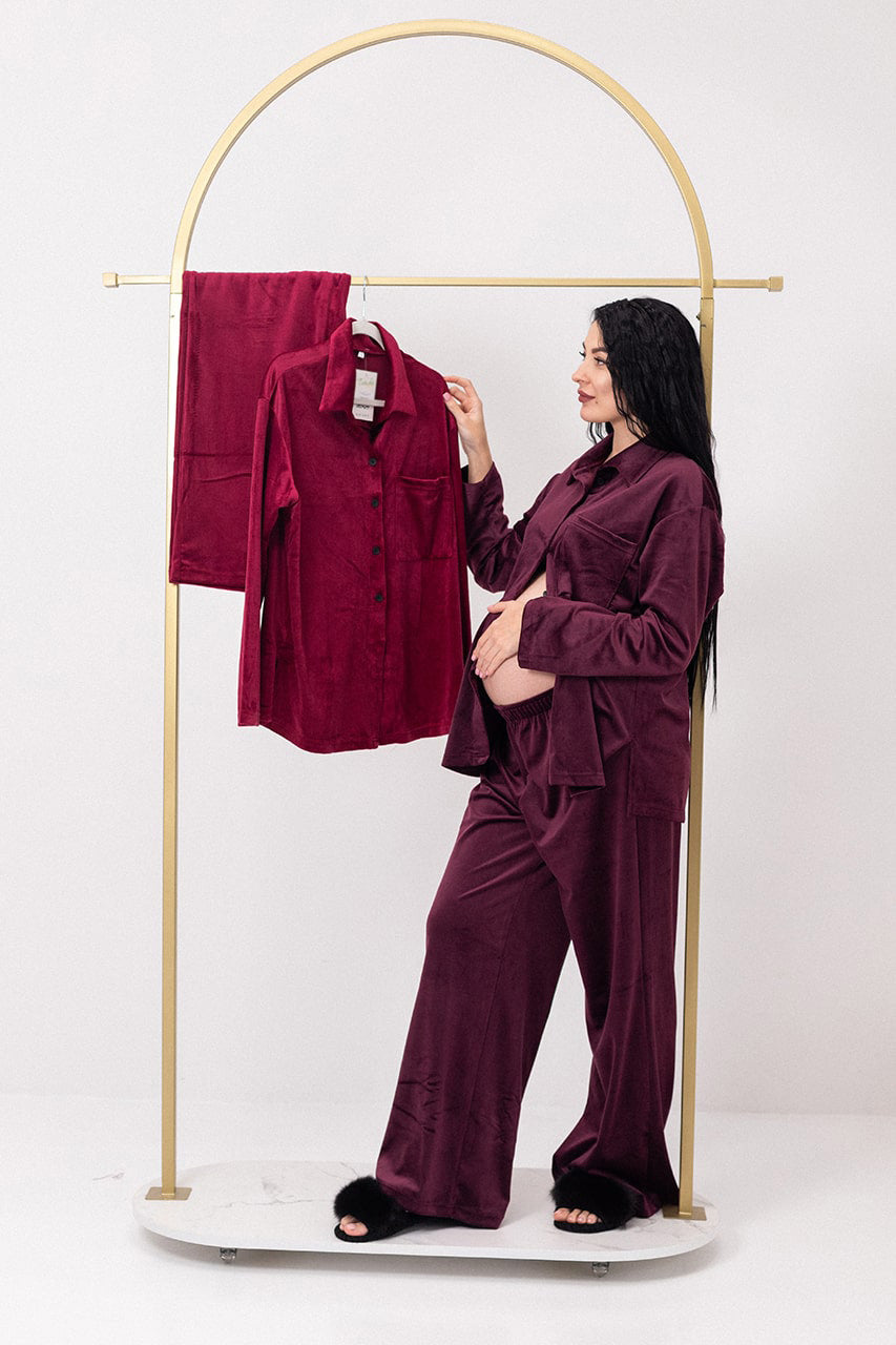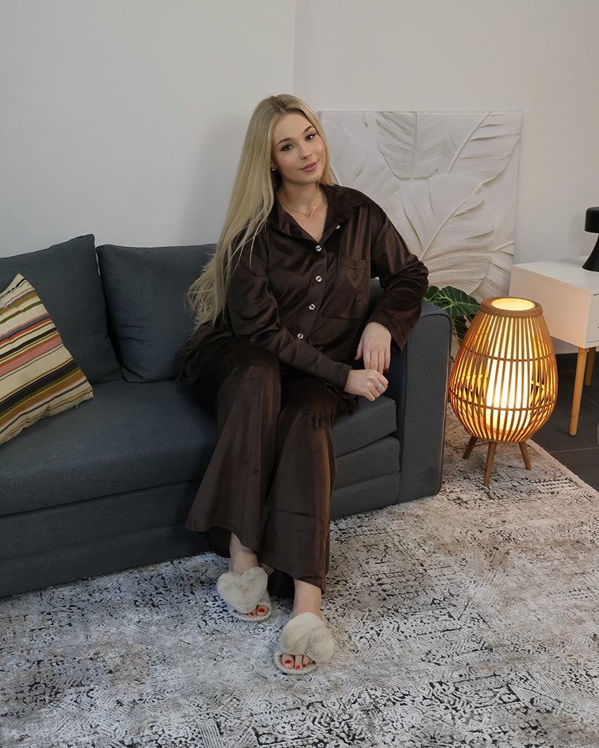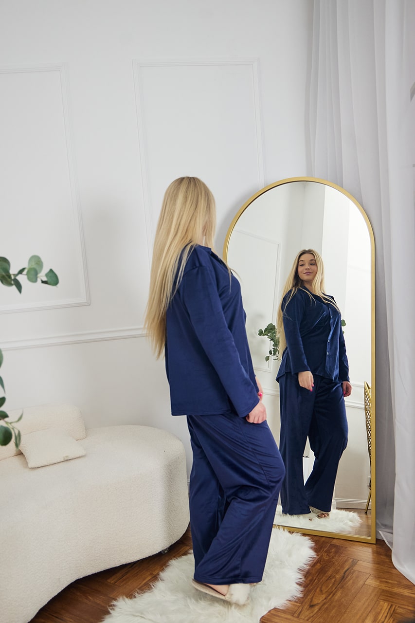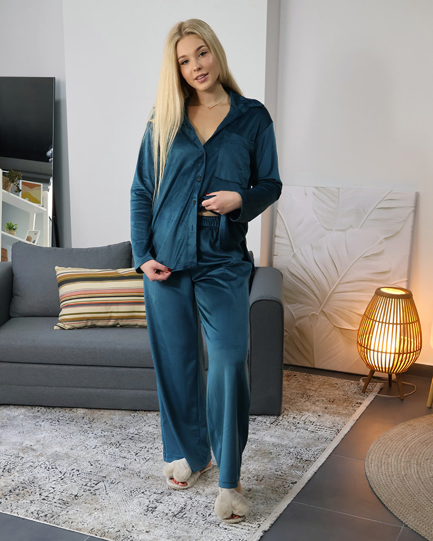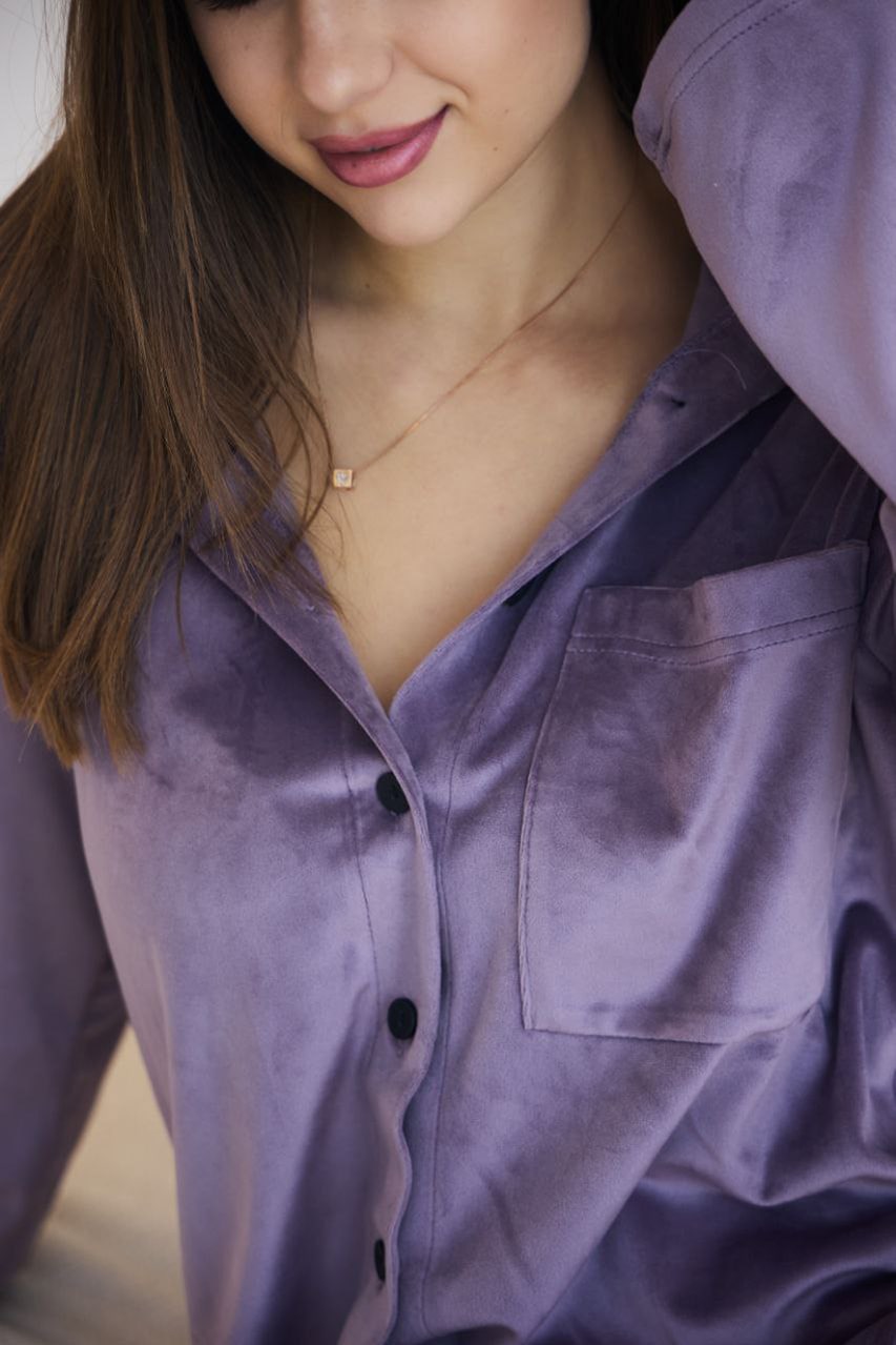 Почуватися привабливою та комфортною вдома - легко разом із нашою піжамою з м’якого плюш велюру на бавовняній основі. Тканина дуже ніжна, еластична й приємна до тіла, має легкий перелив, що надає образу особливого шарму. Тканина добре дихає і чудово тримає форму