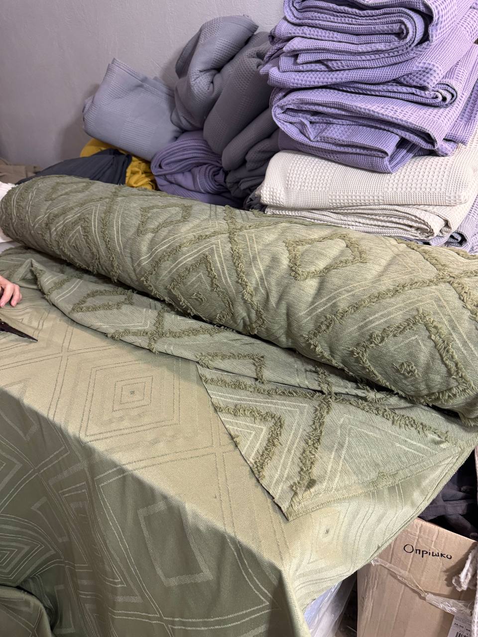 Матеріал не слизький, тому покривало надійно тримається на ліжку або дивані. Незважаючи на те, що воно не надто товсте, воно має приємну вагу — лягає щільно й елегантно, не зминається.