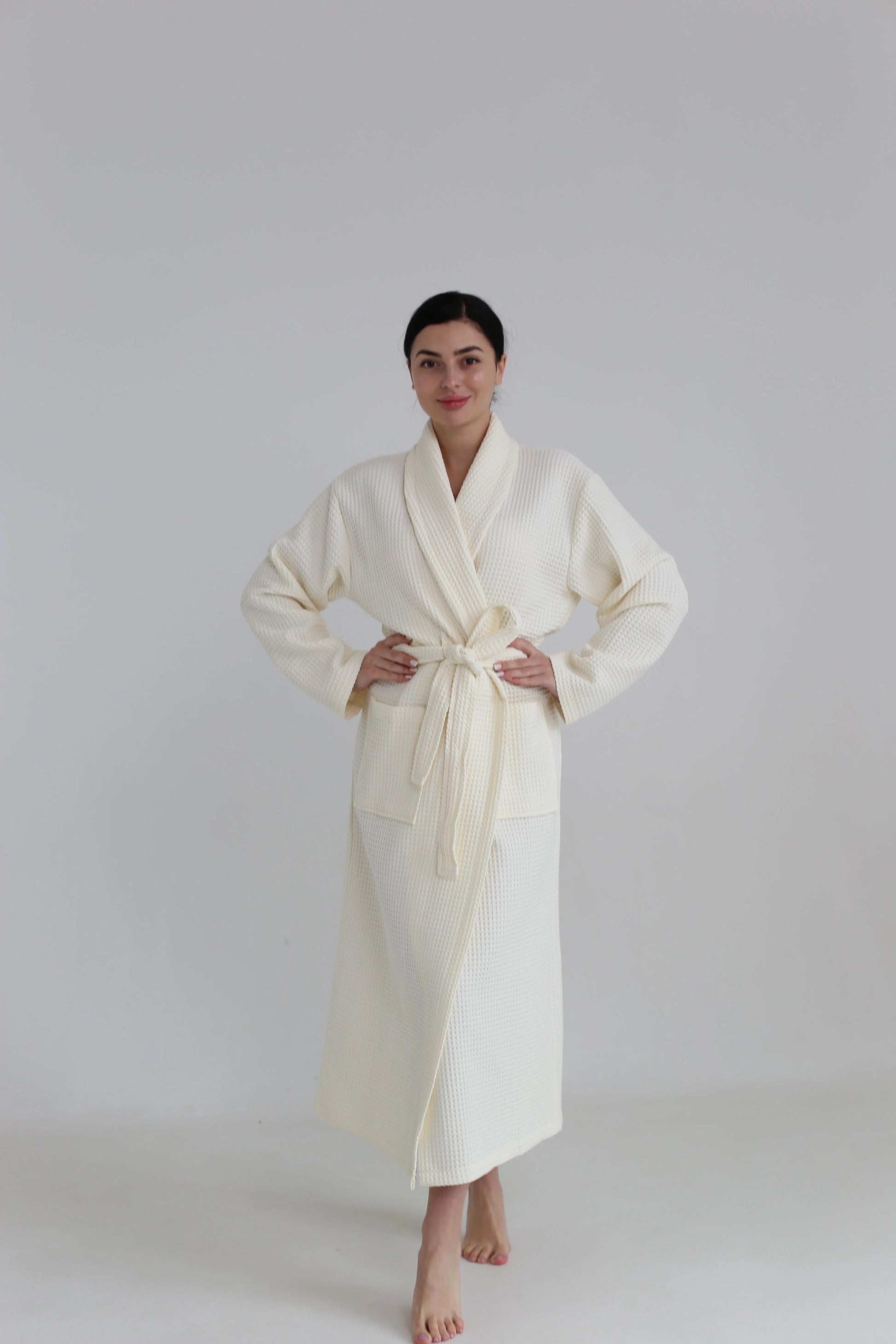 Подаруйте собі відчуття комфорту та свіжості з вафельним халатом-кімоно, виготовленим з натуральної 100% бавовни. Завдяки щільності 320 г/м² халат добре вбирає вологу, не створює парникового ефекту, швидко сохне та дарує приємні тактильні відчуття.